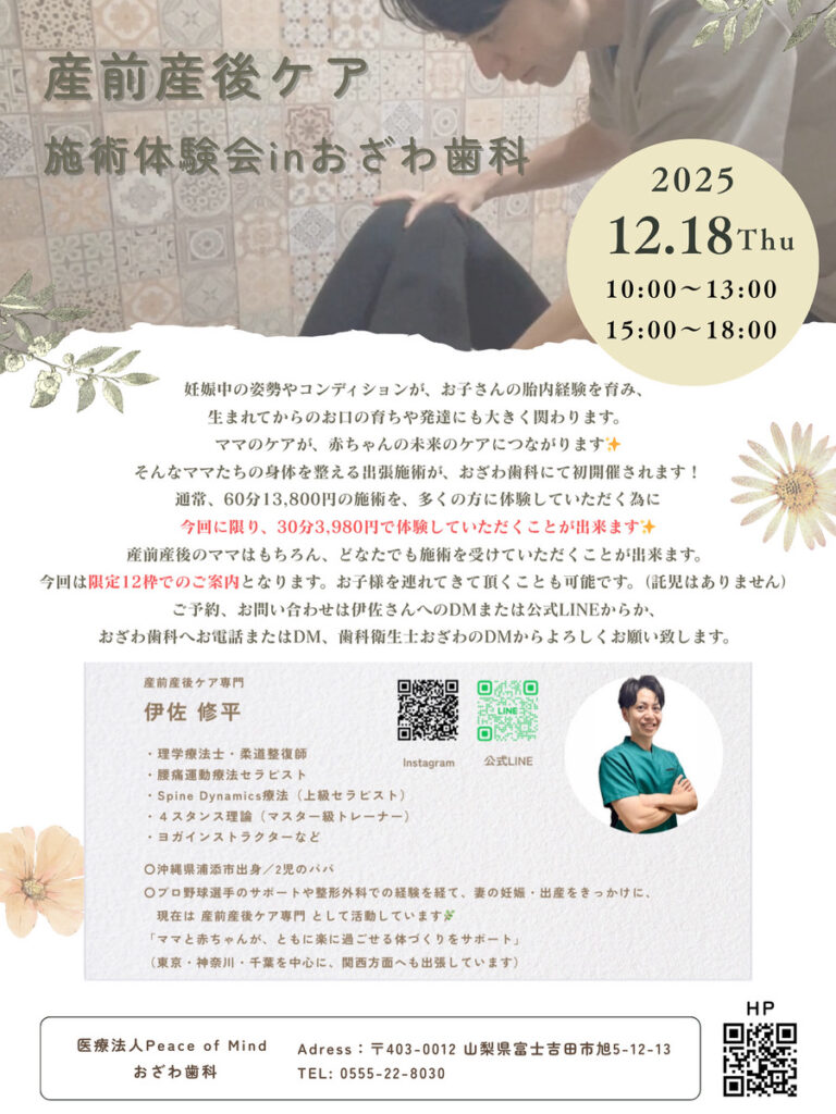 このたび、おざわ歯科では産前産後ケアに特化した出張施術会を、2025年12月18日(木)に初開催することとなりました。